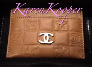 All over it you will recognize the chanel symbols that made the luxury brand a success : The Chanel logo , The No. 5, The Four-Leaf Clover, The Star, The Perfume Bottle, The Camelia The card holder is made of lambskin leather and the color is light moka chocolate. The size is 4" on 2.75" inches, you can store up to 4 cards (credit cards, business cards). This chanel card holder is particularly rare, embossed chocolate bar quilt with Chanel Symbols.